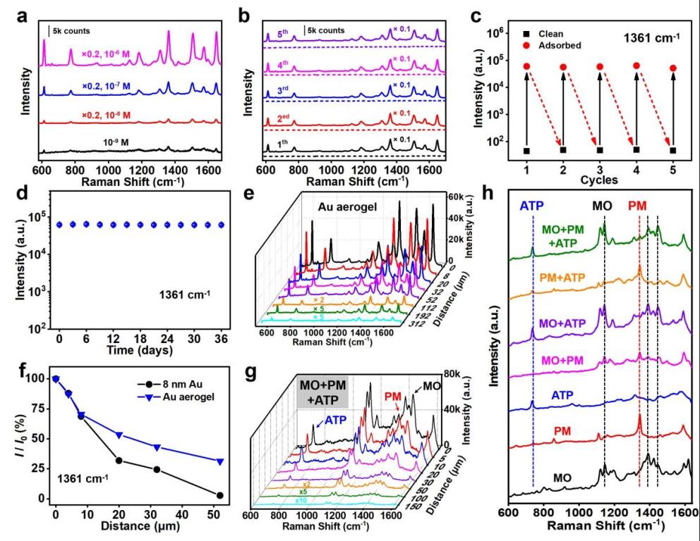 胡悦副教授、北京理工大学杜然教授、德累斯顿工业大学Alexander Eychmüller教授为首的国际团队在前期工作中,通过对金属气凝胶合成方法学的深入探索,开发了一系列可控制备方法,实现了金属凝胶的快速制备及其特征尺寸、比表面积、孔容等多种参数的大范围调控(Sci. Adv. 2019, Nat. Commun. 2020, Matter 2020)。在此基础上,上述团队再次携手,以网络特征尺寸为5-100 nm的金气凝胶为例,从理论与实验两个角度系统探究了气凝胶基底的特征尺寸与SERS活性依赖性。通过对相关参数的优化,不仅获得了大对焦容差的SERS基底(>300 μm),更实现了对染料分子、农药和致癌物质的高灵敏度与多通道检测。