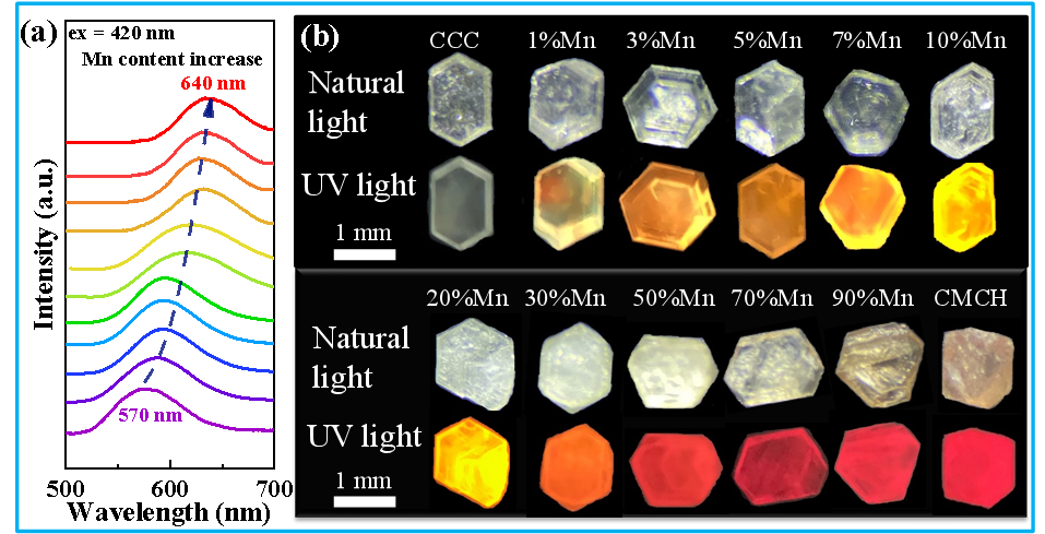 潘跃晓教授指导的研究生黄叶鑫以无机卤化物钙钛矿CsCdCl3为基质,通过Mn2+离子掺杂,诱导CsCdCl3钙钛矿晶体结构收缩,随着Mn2+掺杂浓度的进一步增加,导致向CsMnCl3.2H2O的结构转变,进而研究了掺杂浓度引发对与相变而引起了发光性质变化的规律。通过调节Mn2+掺杂浓度,可调控晶格畸变程度进而实现了发射波长从570 nm到640 nm的移动,并阐述了CsCdCl3:Mn2+的发射机理。CsCdCl3:Mn2+在360、370、420、440 nm不同的激发波长下,均呈现单一的橙红色发光,由此可推测在晶体内只存在一种发射格位,并且该结果可能归因于Mn2+的(4T1(G)-6A1(S))轨道跃迁,从而呈现典型的橙红色发光。