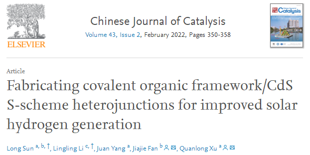 徐全龙副教授在国际著名期刊《Chinese Journal of Catalysis》上发表了题为”Fabricating Covalent organic framework/CdS S-scheme heterojunctions for improved solar hydrogen generation”的研究论文。该工作利用对环境友好、可见光吸收强、能带结构合适、比表面积较大的COF-LZU1与具有空心立方结构的CdS复合,制备出COF/CdS异质结光催化剂,在可见光下表现出良好的光催化析氢性能。当异质结中COF质量含量达到1.5%时,具有最高的产氢速率,为8670 μmol·h−1·g−1,是纯CdS的2.1倍,且在420 nm单色光照射下的表观量子效率为8.9%。