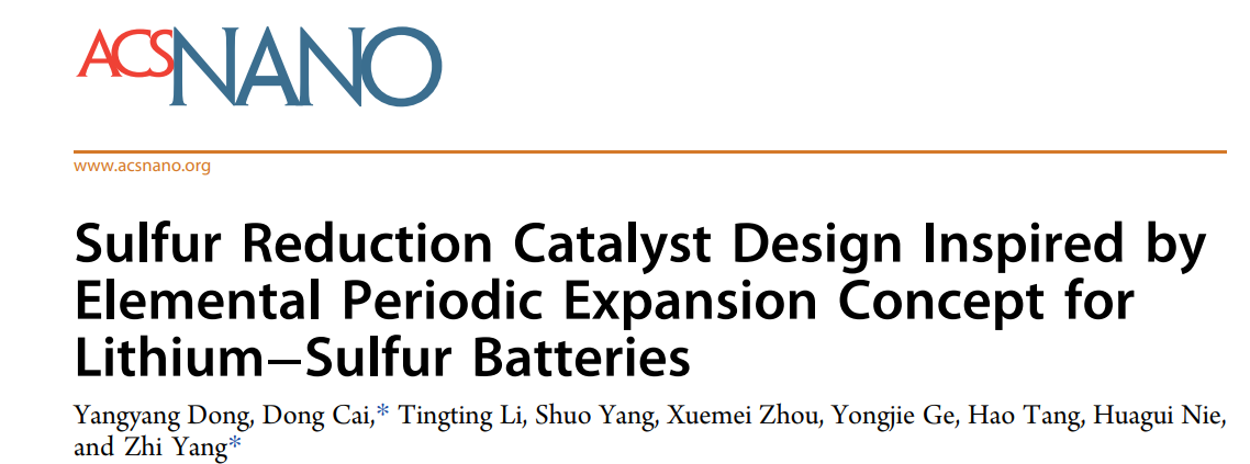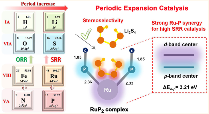 杨植教授课题组在国际著名化学期刊《ACS Nano》发表了题为”Sulfur Reduction Catalyst Design Inspired by Elemental Periodic Expansion Concept for Lithium–Sulfur Batteries”的论文。该工作受启发于天然酶中Fe/N活性位点具有高效的氧还原反应特性(Fe/N→ORR),提出周期扩充催化的概念:利用位于Fe/N下一周期的Ru/P,构建仿生催化分子,协同催化锂硫电池中硫的还原反应(Ru/P→SRR)。