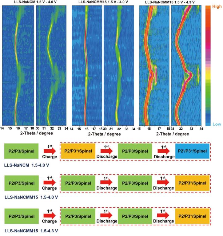 碳中和技术创新研究院侴术雷/肖遥团队在国际顶级期刊《Advanced Energy Materials》上发表题为“Strain Engineering by Local Chemistry Manipulation of Triphase Heterostructured Oxide Cathodes to Facilitate Phase Transitions for High-Performance Sodium-Ion Batteries”的研究论文。本文提出一种基于局域化学调控的应变工程策略来调节材料的物理化学性质成功制备出具有三相异质共生结构层状氧化物正极材料Layered/Layered/Spinel-Na0.5Ni0.2Co0.15Mn0.65O2(LLS-NaNCM)和Layered/Layered/Spinel-Na0.5Ni0.05Co0.15Mn0.65Mg0.15O2(LLS-NaNCMM15),研究发现LLS-NaNCMM15正极具有高度可逆的相转变过程。值得注意的是,LLS-NaNCMM15正极材料在1.5 ~ 4.3 V的电压窗口内也表现出高度可逆的晶体结构演变(P2/P3/Spinel→P2/P3″/Spinel)。同时,该电极具有高的可逆容量和优异倍率性能。本文揭示了局域化学调控机制,实现了正极材料的应变工程,为进一步提高钠离子电池的性能奠定了基础。