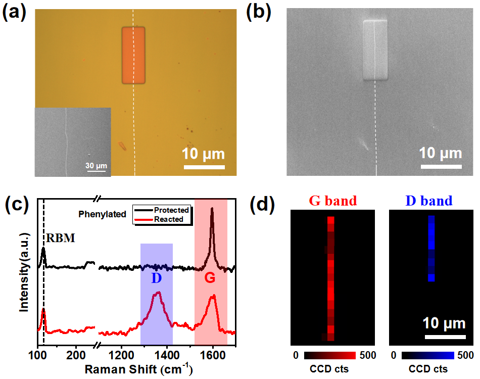 图2. (a) 单根金属性单壁碳纳米管在硅片表面的光学显微镜图像。插图是单壁碳纳米管的SEM图像。注:虚线为模拟单壁碳纳米管的位置;(b) 旋涂PMMA的单根金属性单壁碳纳米管的SEM图像。注:虚线为模拟单壁碳纳米管的位置;(c) 苯基化后532 nm激发的单壁碳纳米管拉曼光谱。(d)苯基化后金属性单壁碳纳米管的G和D峰的拉曼mapping(532 nm激发)。
