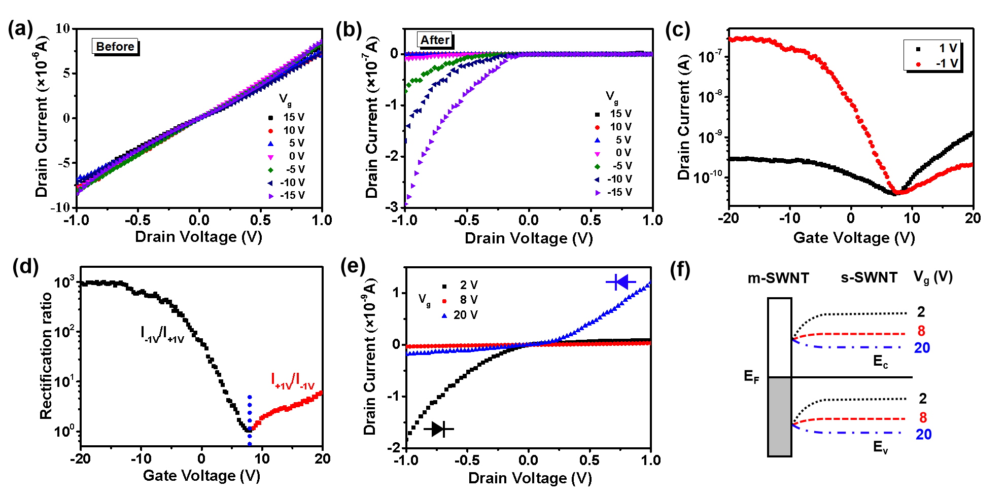 图4. (a, b)苯化前后2-3源漏电极的Ids-Vg曲线。(c) 2-3源漏电极在Vds = 1 V和Vds = -1 V的Ids-Vg曲线。(d) 不同Vg所对应的整流比。(e)不同Vg下肖特基结的整流行为。(f)不同Vg肖特基结处的能带示意图。