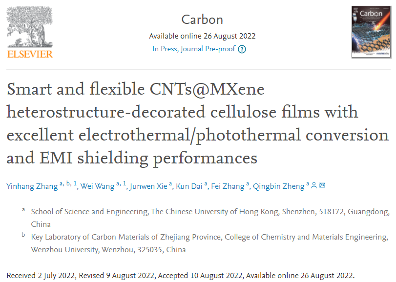 张银行博士联合香港中文大学深圳理工学院郑庆彬教授在国际著名期刊《Carbon》上发表了题名“Smart and flexible CNTs@MXene heterostructure-decorated cellulose films with excellent electrothermal/photothermal conversion and EMI shielding performances”的论文。