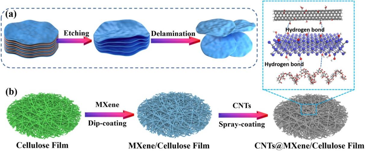 本研究采用双涂层技术制备了CNTs@MXene/纤维素薄膜。该方法有以下几个优点: (1)这是一种不产生有机污染物的绿色制造方法; (2)制备工艺简单, 易于批量生产; (3)在MXene层和CNT层之间形成异质结构层,有利于整体物理性能的提高。