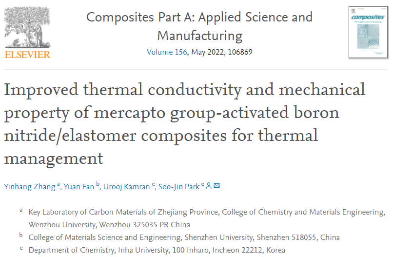 张银行博士联合韩国仁荷大学Soo-Jin Park教授在复合材料TOP期刊《Composites Part A:Applied Science and Manufacturing》发表题名为“Improved thermal conductivity and mechanical property of mercapto group-activated boron nitride/elastomer composites for thermal management”的论文。