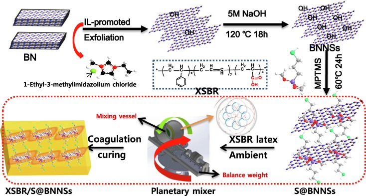 在本研究中,在超声条件下,吸附在氮化硼(BN)表面的离子液体分子使BN容易在咪唑的辅助下剥落成少层的氮化硼纳米片(BNNSs)。进一步合成了3-巯基丙基三甲氧基硅烷(MPTMS)接枝的BNNSs (S@BNNSs),并采用简易的乳胶复合法将其共混到橡胶基体中,最终制备了一种柔性热界面材料(TIM)。本课题系统研究了复合材料的界面之间的相互作用,及其对复合材料导热和机械性能的影响。实际应用测试证明其具有良好的散热潜力。
