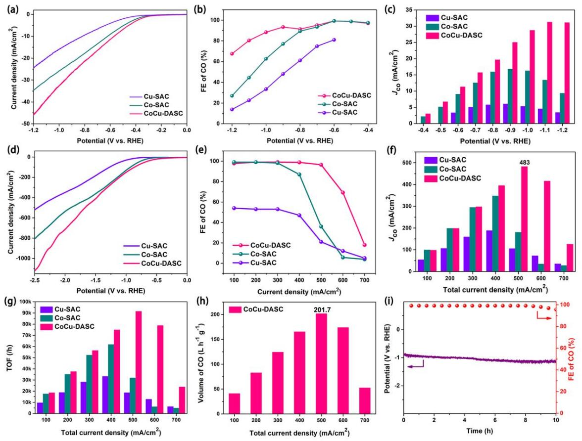 合成得到的CoCu双原子催化剂,在H型和流动型电解池中均表现出优秀的催化活性。在流动型电解池中,CO选择性最高可达99.1%。CO部分电流密度最高可达483 mA cm-2。在100 mA cm-2 ~ 500 mA cm-2的宽电流区间内,CO选择性均在90%以上。经过十小时的稳定性测试后,CO选择性仍能保持在95.6%以上。理论计算表明,跟Co/Cu SACs相比,CoCu双原子催化剂不仅可以促进*COOH的形成,还可以增强*CO的脱附,从而加快反应速率,表现出更优异的CO2电还原活性。