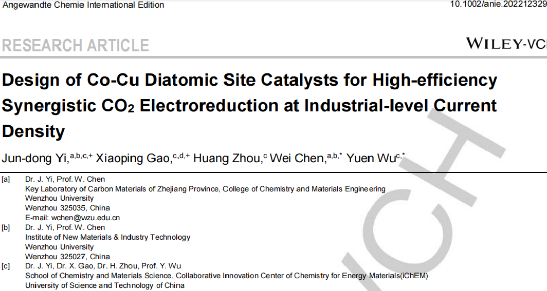陈伟教授和中国科学技术大学吴宇恩教授课题组合作在国际顶级期刊《Angewandte Chemie International Edition》发表题为“Design of Co-Cu Diatomic Site Catalysts for High-efficiency Synergistic CO2 Electroreduction at Industrial-level Current Density”的论文。该工作设计合成了一种新型CoCu双原子催化剂,实现了在大电流下将CO2高效电化学转化为CO。