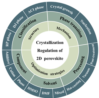 研究和利用钙钛矿太阳能电池实现光电转换,对于解决能源危机和碳排放具有重大意义。近年来,由于二维钙钛矿材料结构的多样性和优异的环境稳定性,二维钙钛矿太阳能电池中获得了广泛的研究和关注。二维钙钛矿太阳能电池的发展必然伴随着对薄膜结晶动力学的深入了解,而晶体取向的控制和量子阱有序排列已成为实现高质量二维钙钛矿薄膜的两个主要因素。迄今为止,已有大量实验研究分析了二维钙钛矿结晶取向对光电转换效率的影响,并提出了多种策略以调控结晶过程。因此我们对二维钙钛矿在太阳能电池领域的研究工作进行了系统的讨论和总结。