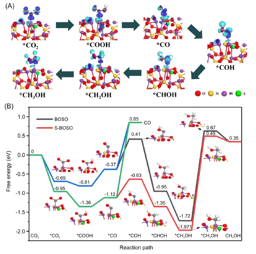 碳中和研究院肖遥团队通过水热辅助表面硫化策略合成了的硫化改性[Bi2O2]2+层硅酸氧铋光催化剂 (S-BOSO),以期获得高效的低浓度CO2还原性能。实验表征结合理论计算从原子层面证明了表面硫化改性的硅酸氧铋纳米片具有电荷富集的铋位点,扩宽了可见光谱吸收,提高了电荷转移效率并构造出丰富的表面活性位。该工作有望推动低浓度CO2还原光催化材料的设计,以实现更广泛的应用。S-BOSO催化性能的提升主要来自于以下三个方面:(1)扩宽的可见光吸收范围;(2)增强的光生载流子分离效率;(3)电荷富集的Bi位点降低了CO2还原反应速率限制步的能垒。该研究为设计具有高活性无机半导体CO2还原光催化剂提供了新思路,也为低浓度CO2转化及太阳燃料光催化剂的设计提供了重要参考。