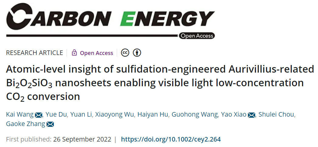 该成果以“Atomic-level insight of sulfidation-engineered Aurivillius-related Bi2O2SiO3 nanosheets enabling visible light low-concentration CO2 conversion”为题发表在高水平期刊Carbon Energy(IF: 21.556)。湖北师范大学王楷副教授为第一作者,男同性恋AV