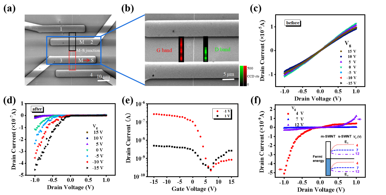 图4. M-S SWNT分子内结的电学测量。(a)单根单壁碳纳米管FET器件的SEM图像。(b) SWNT的G峰和D峰的拉曼mapping (c,d) 2-3源漏电极光氯化前后的典型Ids-Vds曲线。(e)光氯化后2-3个源漏电极在Vds = 1v和-1v时的典型Ids-Vg曲线。(f)不同Vg下分子内结的整流行为。插图为不同Vg下分子内结能带示意图。