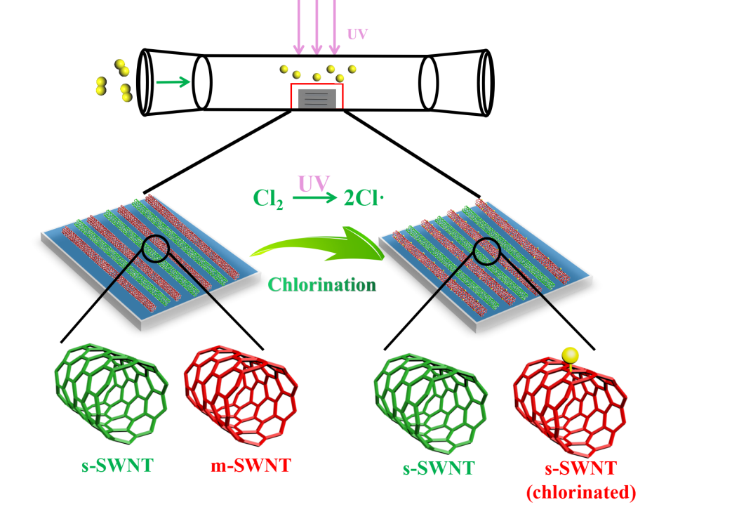 胡悦特聘教授团队联合广东工业大学黄少铭教授与吉林大学赵秋辰教授,提出了一种光氯化法制备半导体单壁材料碳纳米管及其分子内结。如图1所示,氯气在紫外线照射下分解得到氯自由基,可选择性地与金属性单壁碳纳米管共价结合,打开其带隙使其转变为半导体性单壁碳纳米管,最终使得整个单壁碳纳米管水平阵列呈现半导体性并在室温条件下可长期保持稳定性。