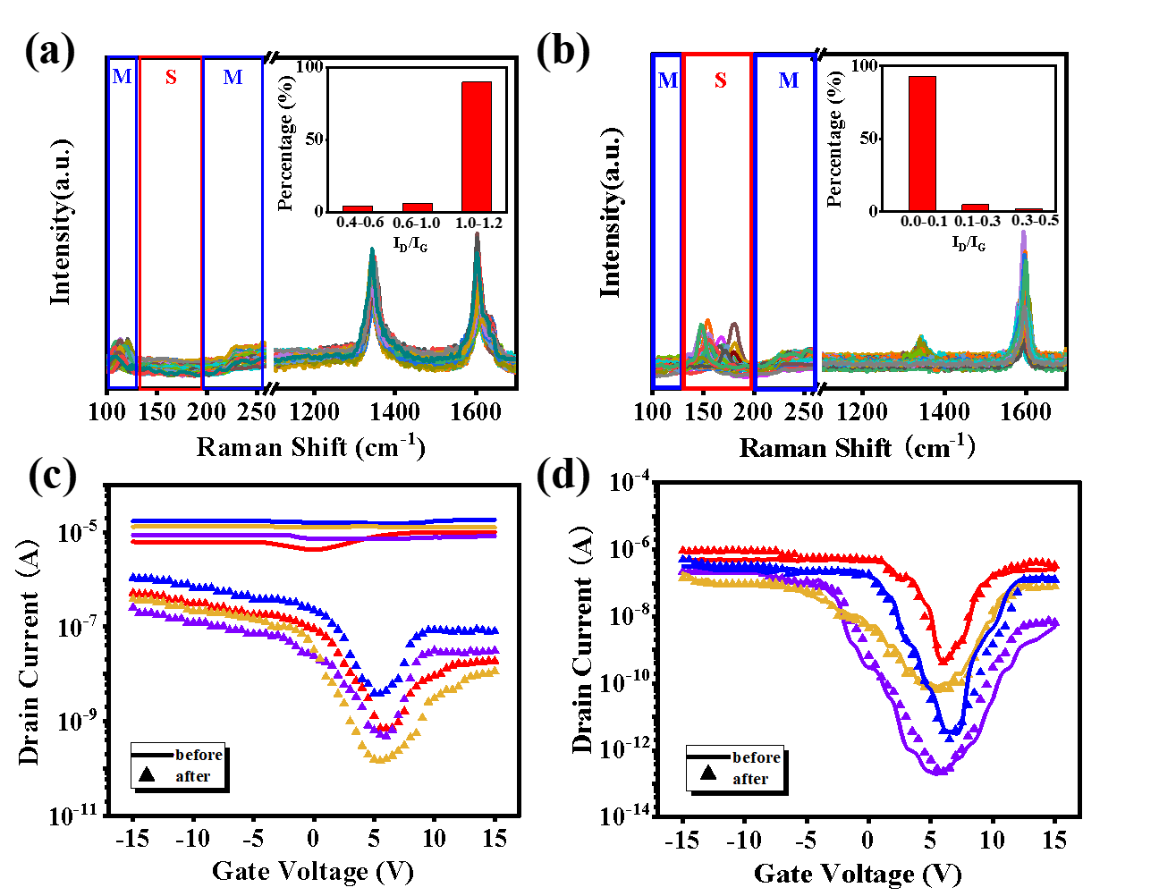 图2.光氯化对m-SWNT和s-SWNT的选择性。(a,b) m-SWNTs和s-SWNTs光氯化后在532 nm激发下的拉曼光谱。(插图:光氯化后m-SWNTs和s-SWNTs的ID/IG比的统计结果)。(c,d) 4个m-SWNT FET器件和4个s-SWNT FET器件在Vds = 1v条件下光氯化前后的典型Ids-Vg曲线(同一颜色对应同一器件)。