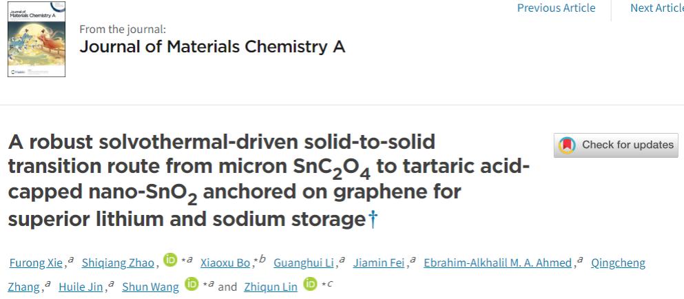 赵世强副教授指导的研究论文“A Robust Solvothermal-Driven Solid-to-Solid Transition Route from Micron SnC2O4 to Tartaric Acid-Capped Nano SnO2 Anchored on Graphene for Superior Lithium and Sodium Storage”。