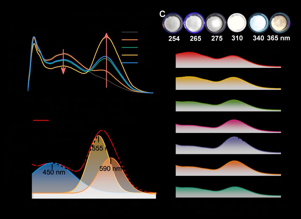 目前,白光LED技术主要依靠单一芯片激发多种混合荧光粉的方式产生白光。然而,由于混合荧光粉各组分物理和光学特性不同,混合过程相对复杂,而且不同的荧光粉在工作电流下的衰减速率不同,导致白光色域随着老化时间的推移而产生偏差,因此,开发高效单组分白光材料显得尤为重要。研究发现,由于一些低维有机-无机杂化金属卤化物和全无机钙钛矿晶体因自身结构的限域以及强烈的电子-声子耦合效应,具有独特的自陷激子(STE)特性,呈现出较大的斯托克斯位移和较宽的发射带。在单组分晶体中,引入掺杂离子,产生多个发射中心,是实现覆盖整个可见光区域的白光的可行策略。然而,如何实现单组分多发射中心光谱的调谐,及优化单组分白光材料的发光效率,仍是亟待探索。此外,目前对具有ns2电子组态的掺杂离子的发光机理也缺乏详细的理论阐述。