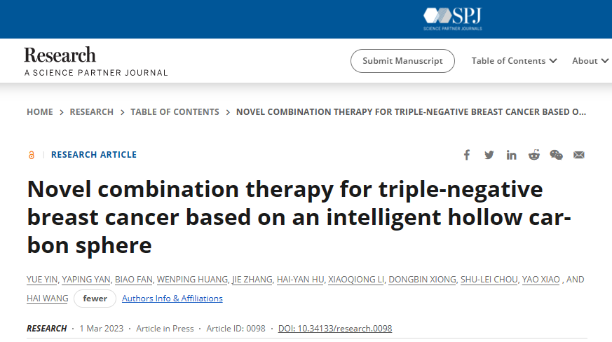 该成果以“Novel combination therapy for triple-negative breast cancer based on an intelligent hollow carbon sphere”为题发表在国际权威期刊《Research》上,IF:11.036,中科院期刊分区表1区。男同性恋AV