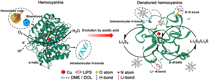 酶作为大自然的特殊催化剂,可以专一高效地催化特定底物反应,已被广泛应用于生物化学领域。具有酶活性的血蓝素(Hcs)作为一种携氧蛋白,可以通过其中心的铜原子对与氧可逆结合,对氧还原反应具有良好的催化活性。受到元素周期扩充理论和酶定向进化理论的启发,通过对Hcs进行电池环境适应性改造,获得了一种新型的催化剂——改性血蓝素(DHcs),将其引入锂硫电池正极以解决穿梭效应和硫转化动力学缓慢的问题。结果表明:经过适应性改造后,Hcs的二级结构由原来的α-螺旋状转变为β-片状,这使得隐藏在蛋白内部的Cu活性中心以及侧链上含O、N官能团得到更充分的暴露。得益于DHcs的独特结构,溶剂化多硫化锂可以通过溶剂分子与蛋白质骨架上暴露出来的官能团形成氢键,有效地富集在DHcs的微环境中。随后,去溶剂化多硫化锂通过S−O键和Li∙∙∙N键与官能团发生相互作用,加速电子/Li+向Cu活性中心的传输,降低了催化活性位点的空间位阻,从而促进了多硫化锂的转化。引入DHcs电池的倍率性能和循环稳定性得到显著提升。本研究为开发改性天然酶作为新型高性能锂硫电池催化剂材料提供了新的前景和实验依据。