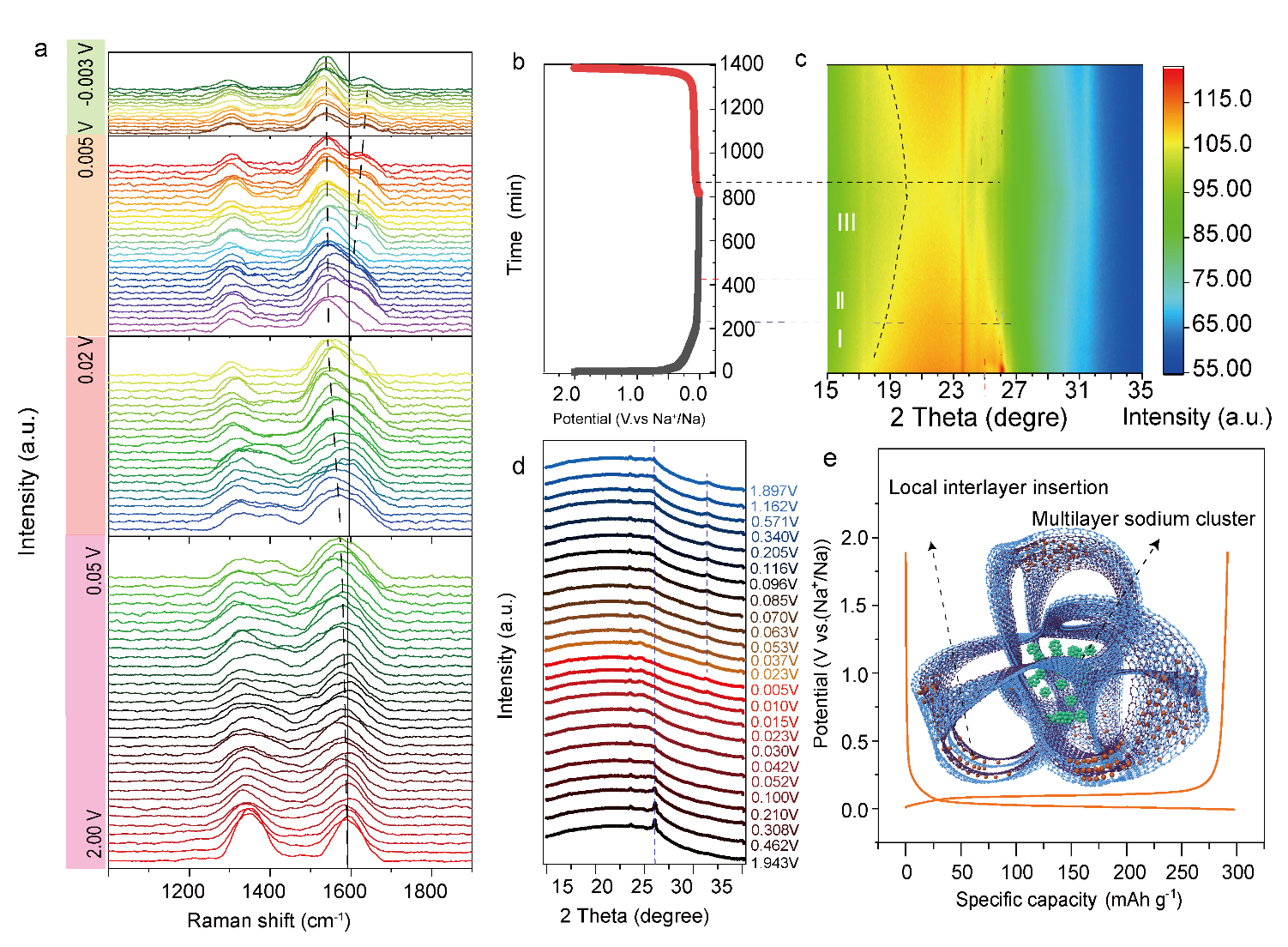 开发低电位(<0.1 V)储钠的钠离子电池负极是推进高能量密度钠离子电池发展的先决条件。锂离子电池商业化石墨负极由于石墨烯层与层之间完全平行堆积导致其层间距较小,无法嵌钠。而当前最具有商业化前景的硬碳负极仍然具有较大比例的电位区间是高于0.1 V的。虽然提高硬碳的石墨化程度可增加平台区的占比,但其通常也伴随着可逆容量的下降。