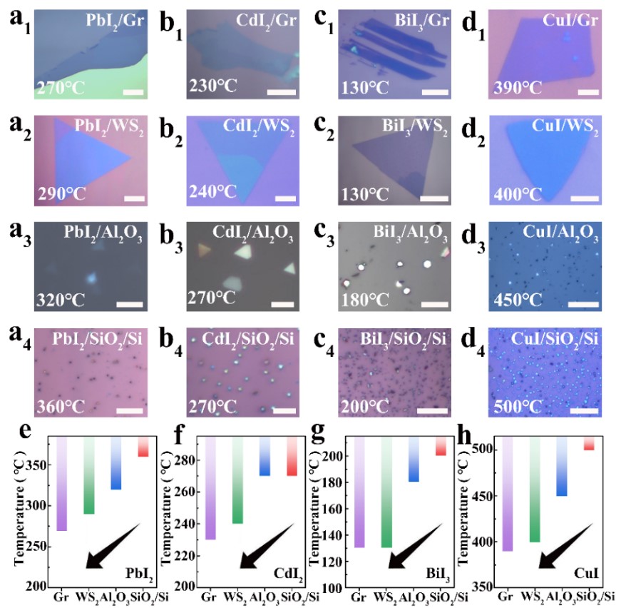 张礼杰研究员等人针对在二维材料的低温可控生长难题,发展了一种普适性的范德华衬底辅助低温外延生长策略,大幅降低了二维碘化物原子晶体的生长温度,实现了系列二维金属碘化物( PbI2、CdI2、BiI3、CuI)在较低温度下的可控生长。系统研究了范德华、非范德华衬底对二维碘化物生长的影响,结合 DFT 计算结合 MD 模拟,发现与蓝宝石衬底相比,碘化物分子在二维范德华衬底(石墨烯、二硫化钼等)的吸附能和扩散势垒大幅降低,适当的吸附能与较低的扩散势垒,促使范德华衬底表面晶体的横向生长。揭示了扩散势垒对二维碘化物生长的影响规律,为低温生长高质量二维材料提供了策略和理论指导,该研究成果以“Van der Waals template-assisted low-temperature epitaxial growth of 2D atomic crystals”为题目发表在在材料领域国际权威学术期刊《Advanced Functional Materials》,男同性恋AV