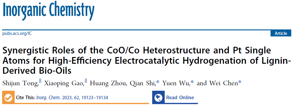 陈伟、时茜教授课题组和中国科学技术大学吴宇恩教授课题组在国际期刊《Inorganic chemistry》发表题为“Synergistic Roles of the CoO/Co Heterostructure and Pt Single Atoms for High-Efficiency Electrocatalytic Hydrogenation of Lignin-Derived Bio-Oils”的论文。该工作通过简单的电化学沉积的方法在CoO/Co异质结构上引入Pt单原子,通过单原子与载体之间独特的协同作用,优化了反应物、中间体和产物在催化活性中心上的吸附行为,从而显示出对苯酚ECH的高催化活性。一方面,由于自由电子从相邻的Co金属转移到Pt单原子位点附近,质子被还原并吸附在单原子Pt位点。另一方面,苯酚以平行构型吸附活化在CoO上。然后,单原子Pt周围的金属Co原子起到了关键的“桥梁”作用,将活化的H物种通过氢溢流转移到吸附的苯酚物种,最终生成KA油。