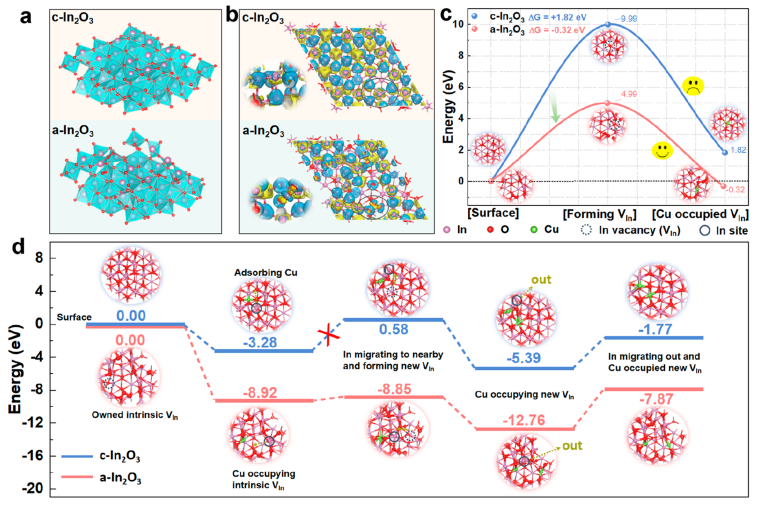 陈伟、时茜教授课题组和中国科学技术大学洪勋教授课题组在国际知名期刊《Nano Letters》发表题为“Amorphization-induced cation exchange in indium oxide nanosheets for CO2-to-ethanol conversion”的论文。该工作在理论计算的指导下,以无定形In2O3纳米片(a-In2O3 NSs)为主体材料,在室温下与多种客体阳离子进行CE反应。密度泛函理论(DFT)计算表明,无定形纳米材料中丰富的配位-不饱和金属位点对于突破CE反应的能垒以调控金属氧化物的组成至关重要。