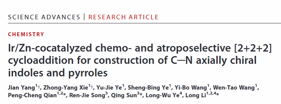 论文链接:Ir/Zn-cocatalyzed chemo- and atroposelective [2+2+2] cycloaddition for construction of C−N axially chiral indoles and pyrroles. Jian Yang1#, Zhong-Yang Xie1#, Yu-Jie Ye1, Sheng-Bing Ye1, Yi-Bo Wang1, Wen-Tao Wang1, Peng-Cheng Qian*1,4, Ren-Jie Song2, Qing Sun*2, Long-Wu Ye3, and Long Li*1,3,4 Sci. Adv. 2023, 9, eadk170. DOI: 10.1126/sciadv.adk1704.