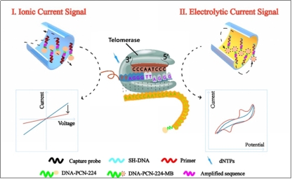 端粒酶是生物过程中一种重要的核糖核蛋白逆转录酶,它可以合成重复序列TTAGGG。作为一种早期癌症诊断的生物标志物,检测端粒酶活性至关重要。近年来,固态纳米孔受到了广泛的关注,它可以通过电流的变化来实现单分子水平的检测。构筑在固态纳米孔中的功能性分子-金属有机框架具有孔隙度好、比表面积大、可调尺寸等优点,可作为纳米孔的信号探针。MOFs本身的尺寸效应适应于纳米孔的大孔径,其中它们作为信号放大器。可封装的MOFs可以作为信号源,因为它们可以封装电活性物质的小分子,这可以提供一种在纳米孔中更灵敏和准确的检测方法。