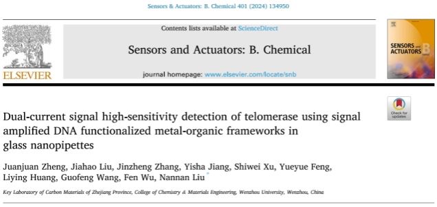 文章链接:Dual-current signal high-sensitivity detection of telomerase using signal amplified DNA functionalized metal-organic frameworks in glass nanopipettes, Sensors and Actuators B: Chemical, 2023, doi: 10.1016/j.snb.2023.134950。