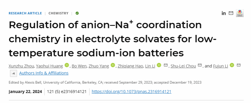 得益于钠高的地壳丰度(2.3 wt%)、较高的理论容量(1165 mAh g-1)及较低的氧化还原电位(-2.71 V),钠离子电池(SIBs)被认为是后锂时代具发展前景的一种电网级大规模储能技术。然而,SIBs在低温下,特别是在-20°C以下,容量低衰减快,其性能提升仍然是极端环境部署的迫切需求。大体上,影响钠离子电池低温性能的因素主要包含以下四方面:(1)电解液内部的离子传输;(2)电极-电解液界面的去溶剂化过程;(3)电极-电解液界面内部的离子传输;(4)电极材料内部的电子和离子传输。值得注意的是,界面Na+去溶剂化过程对低温更敏感,主导电荷转移阻抗,是影响电池性能的限速步。电解液的去溶剂化能取决于Na+-阴离子和Na+-溶剂分子的竞争配位,因此调控电解液的溶剂化化学是加速去溶剂化过程、提升SIBs低温性能的关键。虽然盐浓度和弱配位溶剂对内溶剂化构型的调控是行之有效的,阴离子对溶剂化行为的作用同样不可忽视。深入解析Na+,阴离子和溶剂分子的溶剂化化学对低温SIBs性能的提升至关重要。