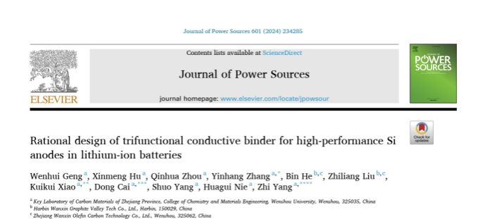 Wenhui Geng,Xinmeng Hu,Qinhua Zhou,Yinhang Zhang,Bin He,Zhiliang Liu,Kuikui Xiao,Dong Cai,Shuo Yang,Huagui Nie,Zhi Yang,Rational design of trifunctional conductive binder for high-performance Si anodes in lithium-ion batteries,Journal of Power Sources,2024