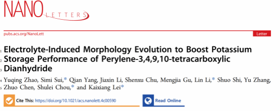 碳中和技术创新研究院李林团队联合河北工业大学雷凯翔副教授在国际权威期刊Nano Letters上发表题为“Electrolyte-Induced Morphology Evolution to Boost Potassium Storage Performance of Perylene-3,4,9,10-tetracarboxylic Dianhydride”的学术论文。文中提出了一种用于有机材料的弱溶剂化电解液,并揭示了电解液对电化学性能的影响机理。电解液不仅表现出较低的溶解能力,而且在充放电过程中诱导了PTCDA的形貌演变。独特的纳米线形貌提高了电化学反应动力学,抑制了PTCDA的溶解。在2000次循环后实现89.1%的高容量保持率。同时,石墨||PTCDA全电池具有卓越的循环稳定性能,展现出强大的实际应用潜力。这项工作提出了一种新颖的解决有机物高溶解问题的思路,为电极材料形貌演变的研究提供了理论基础。男同性恋AV