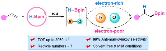 其次,他们创新性地提出了一种通过控制Ir SA催化剂中Ir-O配位键的电子构型来显著提高烯烃硼氢化反应的有效的策略。通过Ni2+空位缺陷的稳定作用,在形貌和尺寸相近的Ni(OH)x和NiOx载体上构建了两种具有Ir-O配位键的Ir SA催化剂。一系列表征证明了Ir1/Ni(OH)x中的Ir-O配位键与Ir1/NiOx相比具有更低的电子密度,因此其氧化性更强。研究发现,在无溶剂条件下的烯烃反马氏硼氢化反应中,具有贫电子特性的Ir-O配位键使得Ir1/Ni(OH)x能够在温和的条件(环境温度、Air、20 min)达到3060 h-1的优异转化频率(TOF)值,是Ir1/NiOx的72倍,远远优于传统的多相Ir纳米催化剂和均相Ir催化剂。结合机理研究和化学计算分析进一步揭示了Ir1/Ni(OH)x优异的活性源于其中存在的贫电子Ir-O配位键的强氧化作用,可使H-B(OR)2的B-H键更有效地断裂,从而使烯烃的硼氢化反应以更低的能垒顺利进行。这项工作将为改变SA催化剂中配位键的性质以优化其性能提供新的线索,并为开发出性能更好的异相催化剂以用于均相有机反应的异相化提供思路。此项工作以《Electron Deficient Ir-O Bonds Promote Heterogeneous Ir-Catalyzed Anti-Markovnikov Hydroboration of Alkenes under Mild Neat Conditions》为题发表在《Nano Letters》上,男同性恋AV