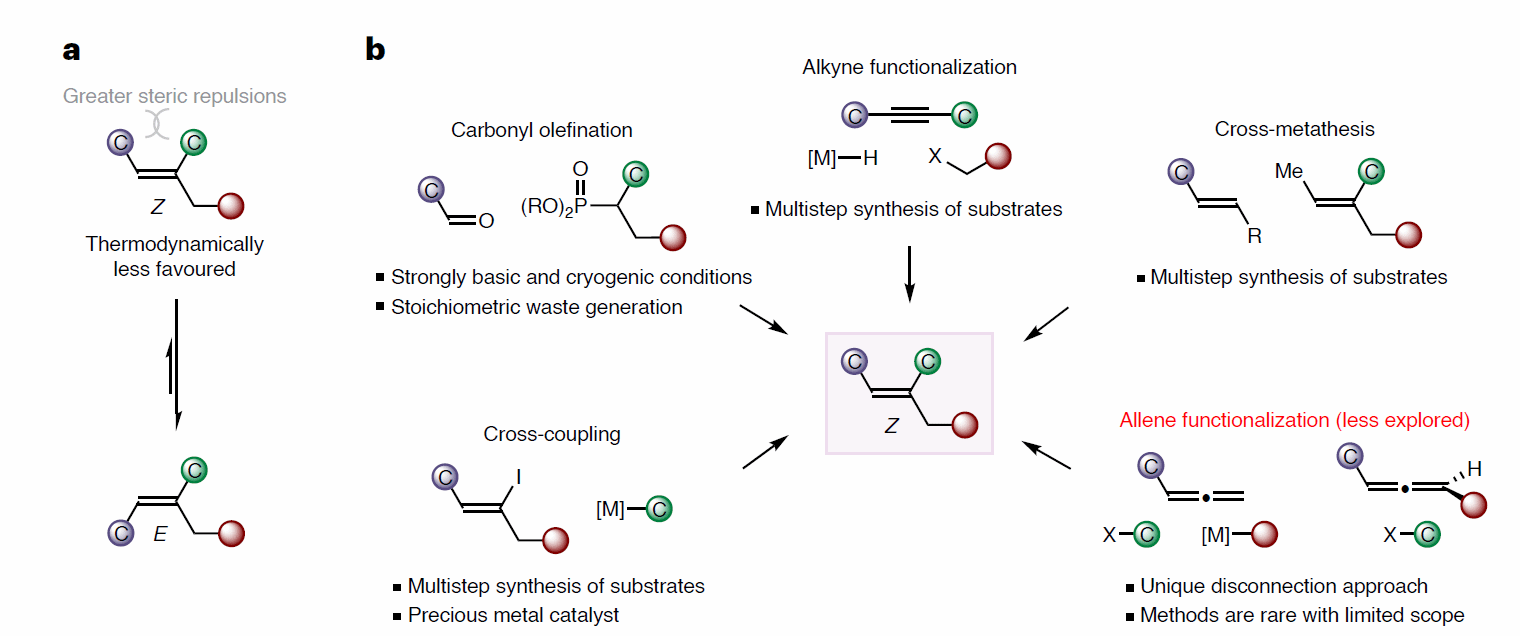 立体专一的三取代烯烃不仅是生物活性分子的关键成分,而且还可以参与各种立体特异性反应以构建sp3-杂化的分子骨架。然而,如何高选择性地构建Z-三取代烯烃仍极具挑战性,这是因为其结构存在较大的空间排斥,进而在热力学上不太有利。迄今为止,化学家利用动力学控制来制备Z-三取代烯烃的方法少之又少,包括:碱介导的羰基烯化、炔烃碳官能团化、烯丙醇或Z-烯基碘化物的立体保留交叉复分解和交叉偶联反应,而且这些方法大多需要繁复的合成步骤、苛刻的反应条件以及预先安装活化基/导向基,严重地限制了合成应用。