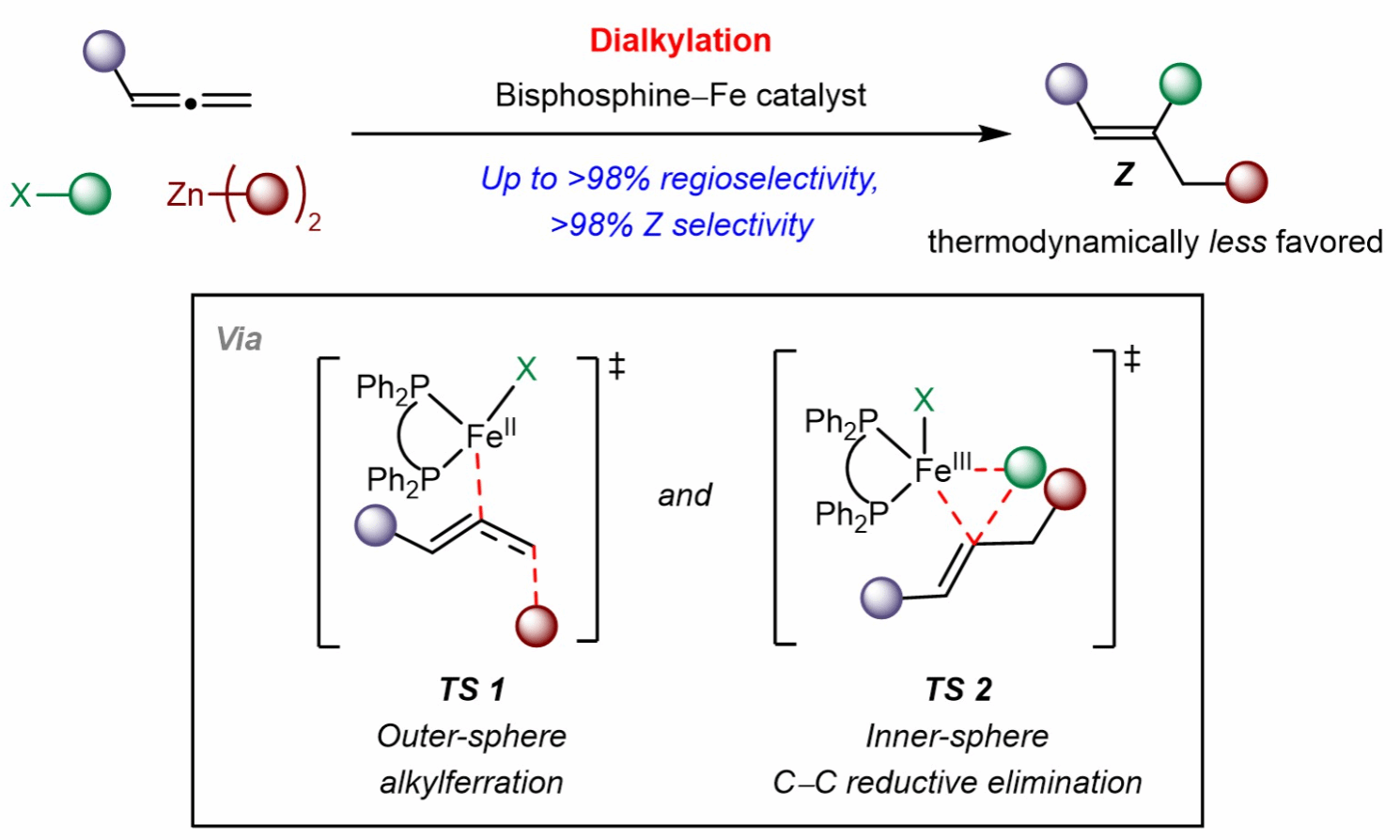 钱鹏程教授课题组与新加坡国立大学Ming Joo Koh教授课题组,香港中文大学章兴龙助理教授合作报道了铁催化联烯、二烷基锌化合物和卤代烷烃的多组分反应,以优异的区域选择性和Z-选择性构建了一系列三取代烯烃,包括葡萄糖神经酰胺合成酶(GCS)抑制剂。机理研究表明该反应是由动力学控制的(即自由基介导位阻较小C=C键的铁烷基化和通过还原消除进行的内球烷基化),这与金属催化联烯官能团化反应的传统机制形成鲜明对比。