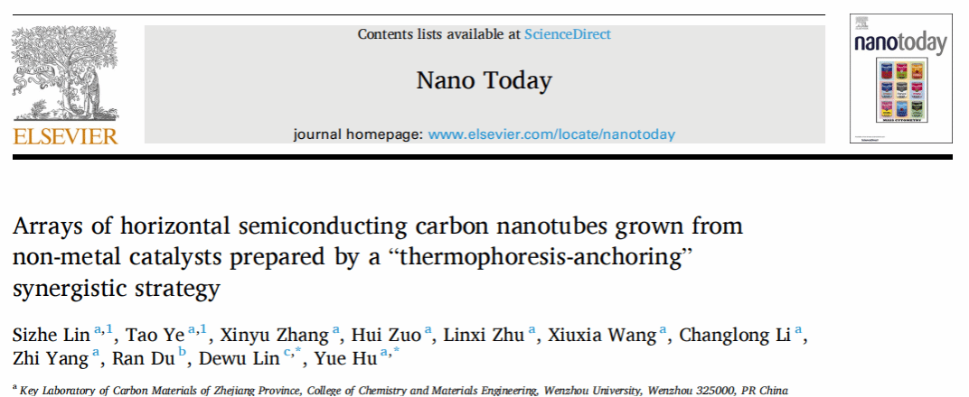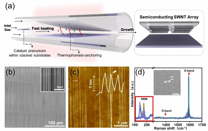 胡悦特聘教授团队与香港城市大学林德武研究员合作,发展了一种名为“热泳-锚定”的策略,成功制备出均匀分散且尺寸可控的非金属SiOx催化剂,用于生长水平排列的SWNT阵列。该策略通过硅基热解前驱体产生大量SiOx颗粒,由于温度迅速升高引起的热浮力,这些颗粒在石英基底上发生自下而上沉积。同时,机械力诱导促进的表面重构在石英衬底上形成大量锚点,有助于捕获催化剂,抑制其迁移和聚集,从而实现小尺寸催化剂的均匀沉积。利用这些非金属SiOx催化剂,研究团队成功合成了密度高达9根每微米的SWNT阵列。值得注意的是,拉曼光谱和电学表征显示,这些直接生长的SWNT阵列中半导体的比例高达94%,这一成果归功于密闭空间内原位蚀刻机制。这项工作为下一代碳基纳米器件的技术实际应用提供了一条切实可行的路径。