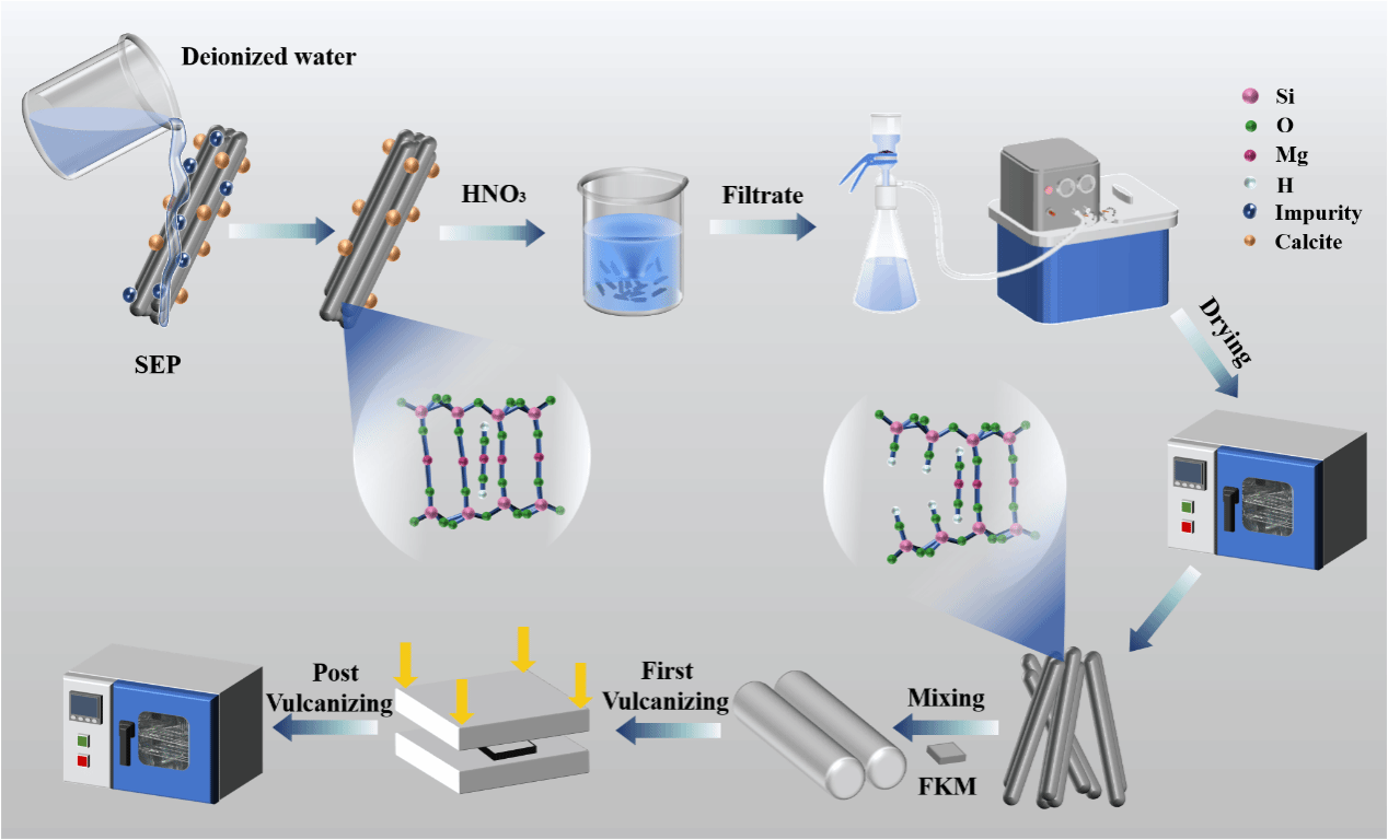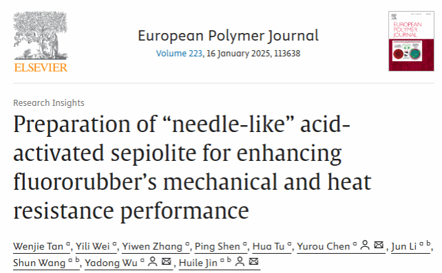 该成果以“Preparation of “needle-like” acid-activated sepiolite for enhancing fluororubber’s mechanical and heat resistance performance”为题发表在European Polymer Journal期刊(IF=5.8,SCI二区)上,男同性恋AV