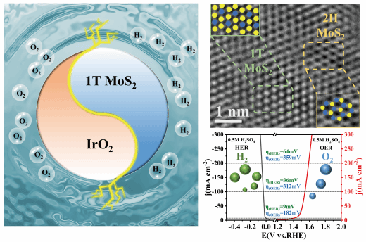 杨植教授、周学梅博士联合西北工业大学高唯博士通过相工程调控策略,制备了IrO2/MoS2/CNT异质结催化剂。通过将IrO2掺入到MoS2/CNT,诱导MoS2从2H相部分相变1T相,显著提升了催化剂的导电性和催化活性。碳纳米管(CNT)的加入进一步增强了催化剂的导电性和结构稳定性。结果表明,在酸性环境下,IrO2/MoS2/CNT催化剂表现出卓越的全电解水催化性能。通过多种原位实验和DFT计算等手段系统揭示了其电解水催化性能增强的原因。
