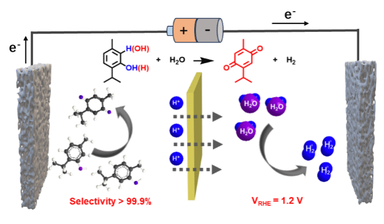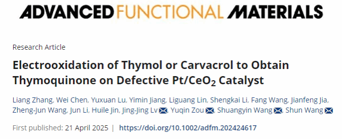 百里醌(TQ)是一种具有多种药理功效的化合物,然而其从天然来源获取的数量有限。该研究报道了一种高效电催化剂设计,即负载在具有丰富氧空位的CeO2(Vo-Pt/CeO2)上的铂团簇,用于电催化氧化百里酚(TY)或香芹酚以制备TQ。向Vo-Pt/CeO2表面引入氧空位显著降低了TQ的吸附能,促进了其脱附,从而防止了产物积累和催化剂中毒。因此,Vo-Pt/CeO2展现出了卓越的电催化性能,在1.2 VRHE下实现了约100%的选择性以及高达98%的TQ产率。原位拉曼光谱表明,TY的电催化氧化机理涉及水进攻TY中间体形成百里氢醌,随后百里氢醌被氧化为TQ。该研究工作为催化剂设计提供了新思路,并为可持续合成TQ提出了一种新策略。