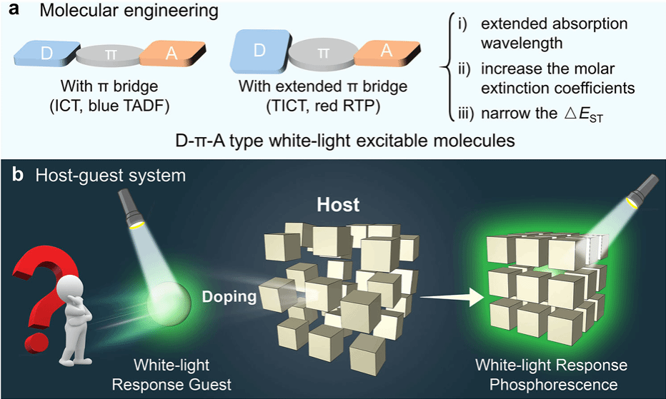 有机室温磷光材料凭借高生物相容性、低毒性及官能团易修饰等特性,在生物组织诊疗中具有天然优势。然而,多数有机室温磷光材料仅能被短波紫外光激发,而紫外光对生物组织损伤较大,制约了其在临床成像中的实际应用。因此,设计与制备可白光激发的磷光材料将极大拓展生物成像应用场景。