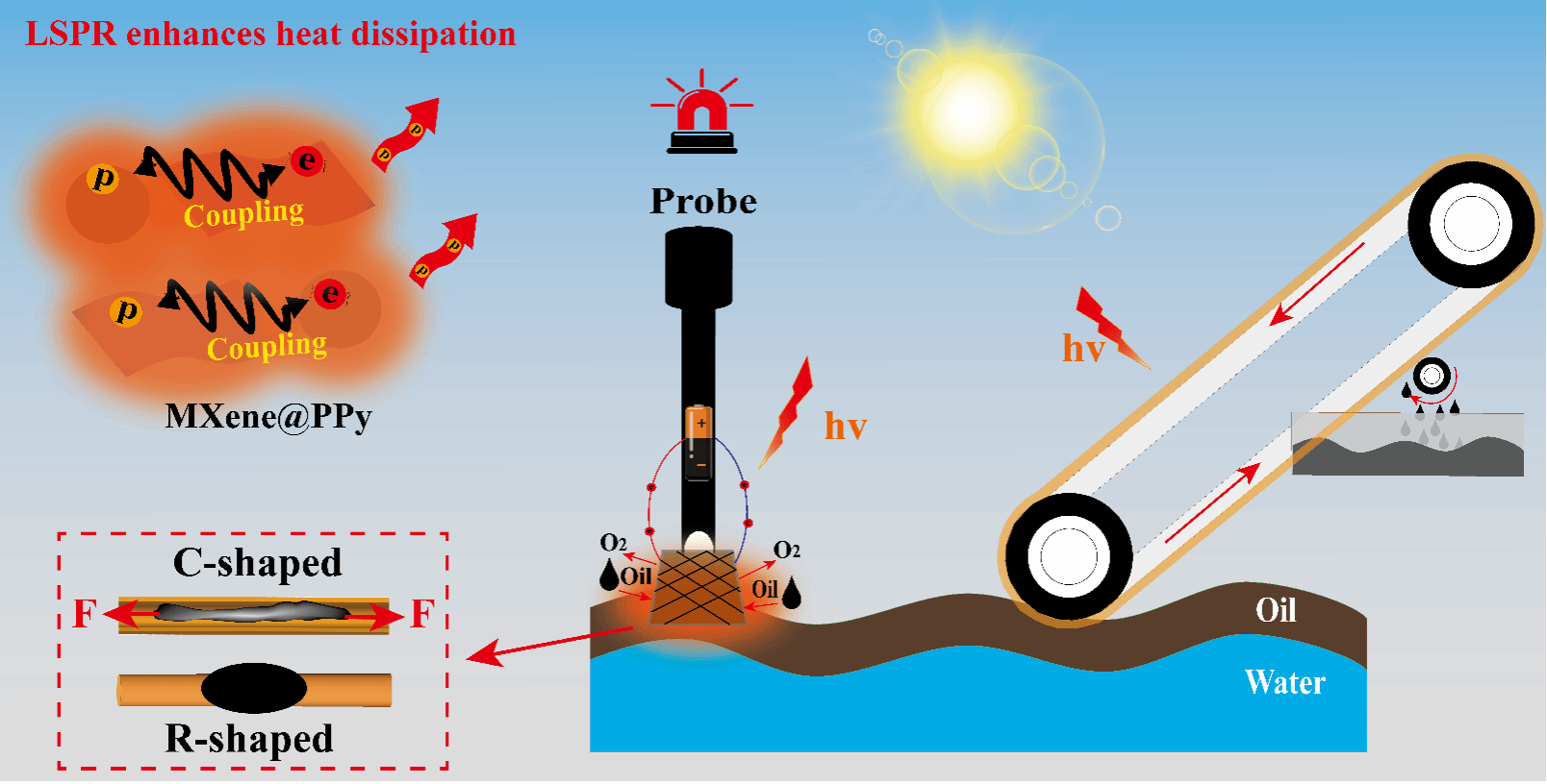 由于重质原油具有高粘度特性,其泄漏监测和高效回收始终面临技术挑战。团队将异形截面的聚丙烯纺粘非织造布(NWF)与聚吡咯(PPy)和 MXene(H-MXene/PPy/PEG/PP)涂层相结合,构建了超疏水可加热高粘度原油吸附材料,成功应用于海洋原油泄漏现场监测和高效清除。该材料展现出卓越的光热转换与焦耳热能转化能力,同时具备优异的原油吸附速度和容量。在1千瓦/平方米的太阳辐射或5伏低压条件下,其表面温度分别可提升至101℃和73.5℃。在1千瓦/平方米光辐射下,该材料仅需54秒即可完成原油泄漏检测,并以每平方米每小时176.5公斤的惊人速率实现泄漏高粘度原油的持续回收。该工作系统地研究了纤维横截面形状、加热模式和操作条件对吸附材料表面温度、表面散热指数、表面热容、溢油泄漏响应时间(RT)、溢油吸收能力和分离效率的影响规律,发现异形截面的纤维可以提升无纺布的原油吸收速度,从而缩短溢油泄漏响应时间,提高溢油回收速率;并观察到由光与焦耳相结合加热条件的大幅度非牛顿型散热机制,表现为异常高(1.66 至 2.77)的散热指数。