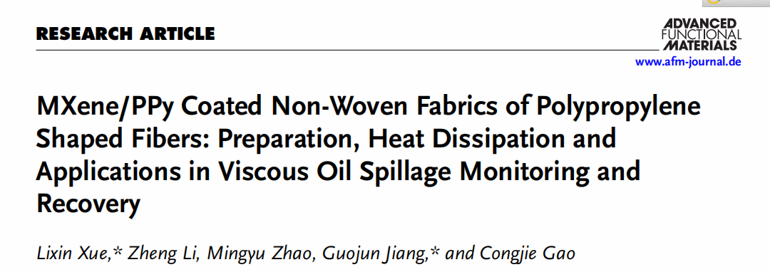 该研究成果以“MXene/PPy coated non-woven fabrics of polypropylene shaped fibers: preparation, heat dissipation and applications in viscous oil spillage monitoring and recovery”为题,发表在国际期刊《Advanced Functional Materials》上。该工作的指导老师包括男同性恋AV