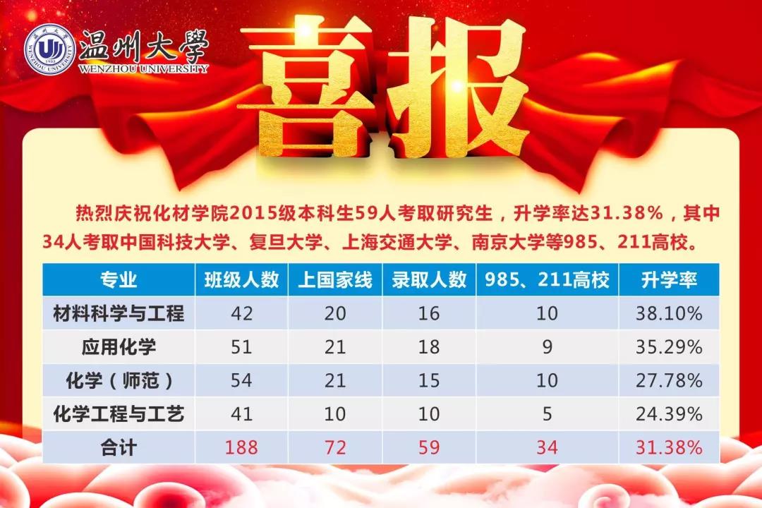 2019届学生考研工作再创佳绩。学院2019届毕业生共188人,90人报考研究生考试,71人过国家复试线,过线人数达到报考人数的78.9%;其中59人成功被录取,录取人数达到报考人数的65.6%,升学人数占全体本科毕业生数的31.4%;有34人被中科院、复旦大学、南京大学、上海交通大学等985、211高校录取,考研录取率和考取名校人数创历史新高。