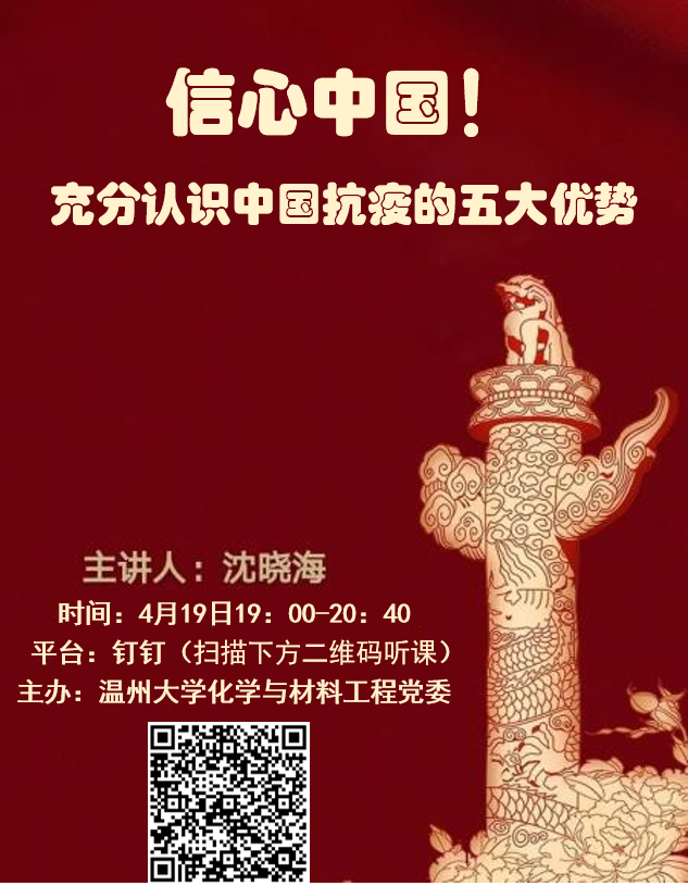 为进一步引导广大学生厚植爱国情怀、坚定理想信念,增强“四个意识”、坚定“四个自信”、做到“两个维护”,坚定在以习近平同志为核心的党中央坚强领导下打赢这场疫情防控战的信心和决心,深刻认识中国抗疫彰显的中国共产党领导和中国特色社会主义制度的显著优势,承担责任使命,努力争当先锋。学院邀请南京师范大学“网红”辅导员沈晓海老师,主讲 《信心中国!充分认识中国抗疫五大优势!》。