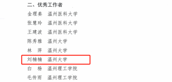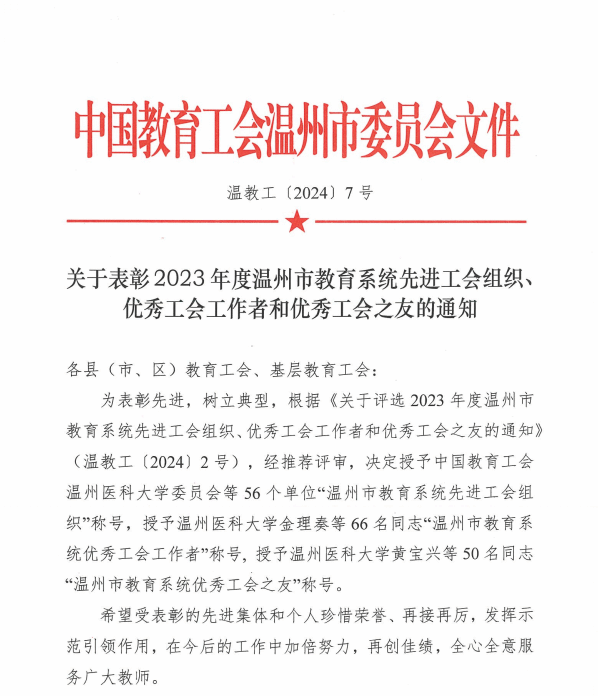 近日,中国教育工会温州市委员会印发《关于表彰2023年度温州市教育系统先进工会组织、优秀工会工作者和优秀工会之友的通知》(温教工〔2024〕7号)。其中,我院工会被评为温州市教育系统先进工会组织;院分工会主席刘楠楠老师被评为温州市教育系统优秀工会工作者!