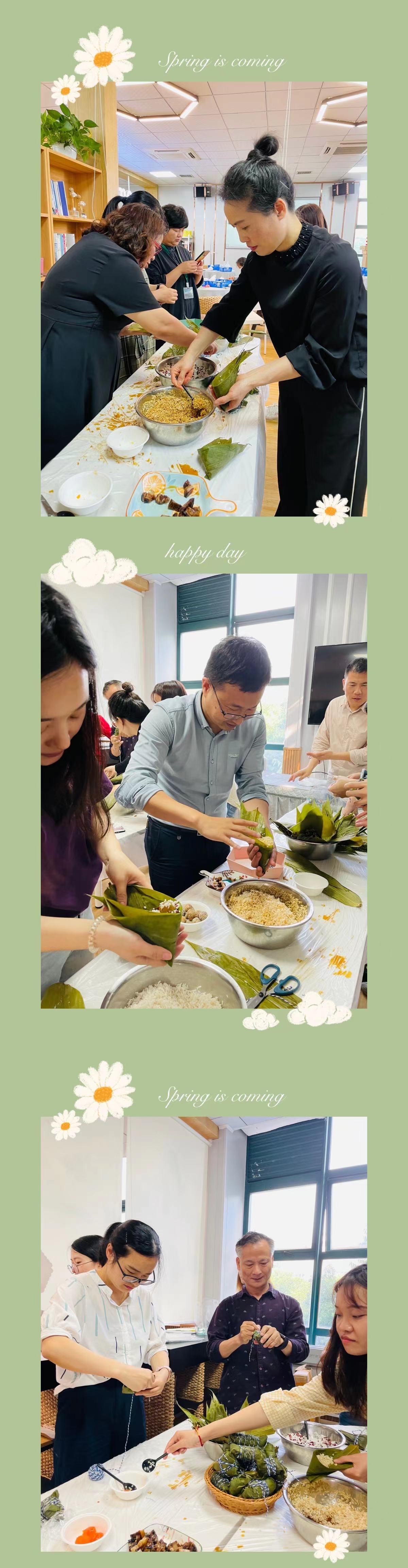 紧接着第二关:我们的重头戏来了“齐心包粽子”。学院工会把提前泡好的糯米、蜜枣、荷叶等材料整齐地摆放在桌子上,老师们围坐在一起交流端午习俗及包粽子经验,现场气氛十分热闹。在包粽子的过程中,大家纷纷亮出“看家本领”包粽子,有正常的,有“不正常”的,有四角的,也有“一整块”的,大家包的不亦乐乎。