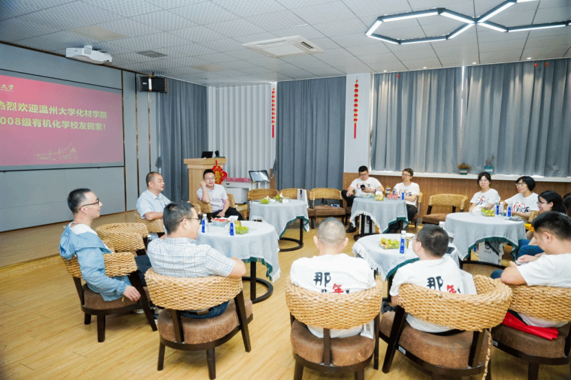 2008级有机化学专业12名校友从全国各地齐聚温州,重返母校,举行研究生毕业13周年聚会活动,重温师恩,共叙友情,共忆在温大的美好大学生活。学院副院长金辉乐、学工办主任邹涌彬、学院时任班主任邵黎雄、导师代表吴华悦、成江、刘妙昌等参加座谈会。